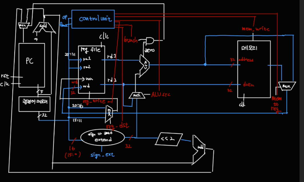 레지스터파일과 메모리에도 clock 입력을 넣어주고, control unit 을 추가했다.