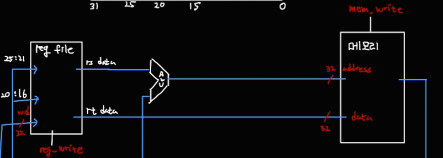 기존 회로에서 rt 필드의 값을 메모리의 쓰기 데이터로 보내는 패스만 추가해주면 된다.