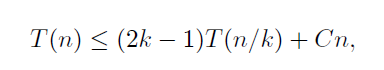 따라서 Cn 이 lg n / lg(1/α) 번 반복되므로, 시간복잡도는 O(n log n) 이다.
