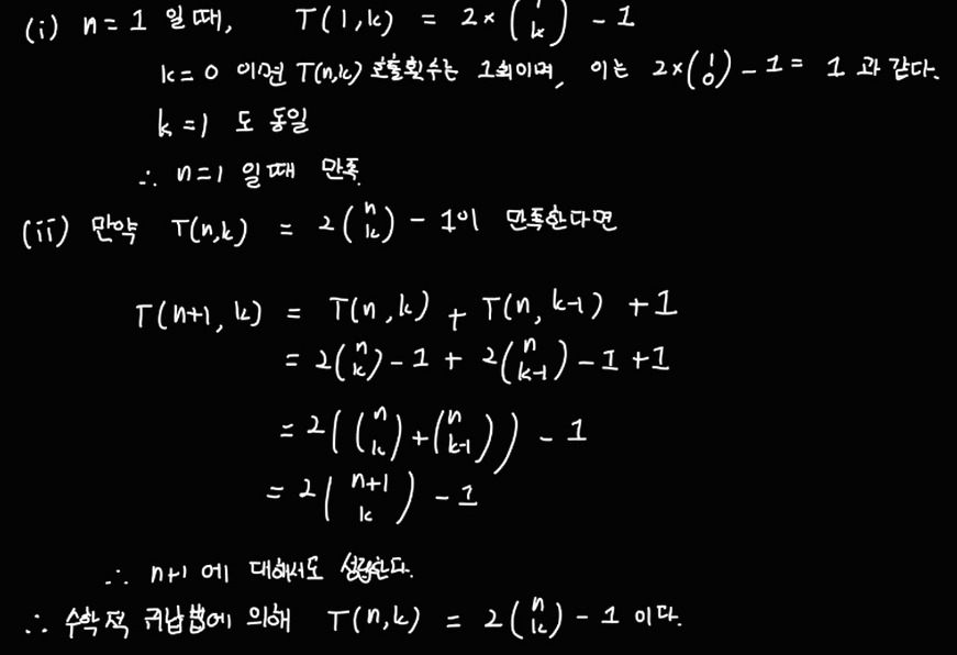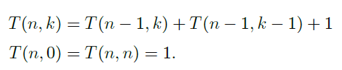 이를 이용하면 T(n, k) 의 값이 2 x (nCk) - 1 과 같음을 보일 수 있다.