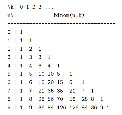 이항계수의 값이 다른 이항계수의 값을 이용해 재귀적으로 표현됨을 알 수 있다.