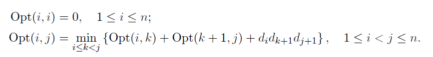 Opt(i, j) 를 i번째 행렬부터 j번째 행렬까지 곱한 최적의 (최소의) 연산량이라고 할 때, 그 값은 위와 같이 구할 수 있다.