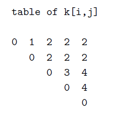 그리고, (i, j) 에 대해 어떤 k 값이 최적이었는지를 표로 출력하면
