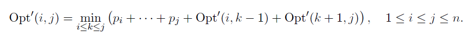 Opt(i, j) 를 i번째 행렬부터 j번째 행렬까지 곱한 최적의 (최소의) 연산량이라고 할 때, 그 값은 위와 같이 구할 수 있다.