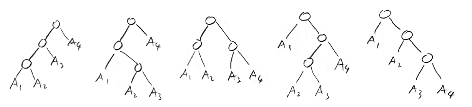 따라서 n개 행렬 곱셈 순서의 경우의 수는 아래와 같이 n-1 개 노드로 이진트리를 만드는 경우의 수, 즉 n-1번째 카탈란 수와 같다.