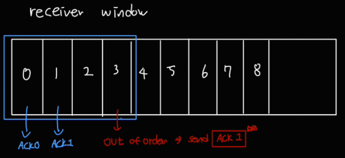 이 범위 내에 존재하는 패킷을 받으면 패킷 n에 대해 ACK를 수신했다고 마킹하고, 아직 ACK를 받지 못한 패킷 중에 제일 작은 n 을 갖는다면, 윈도우를 다음으로 ACK를 받지 못한 패킷으로 슬라이딩 한다.