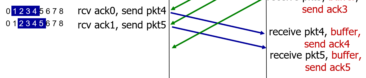 ack0, ack1 이 sender에게 도착하면, sender는 슬라이딩 윈도우를 한칸씩 밀면서 pkt4, pkt5를 보낸다.