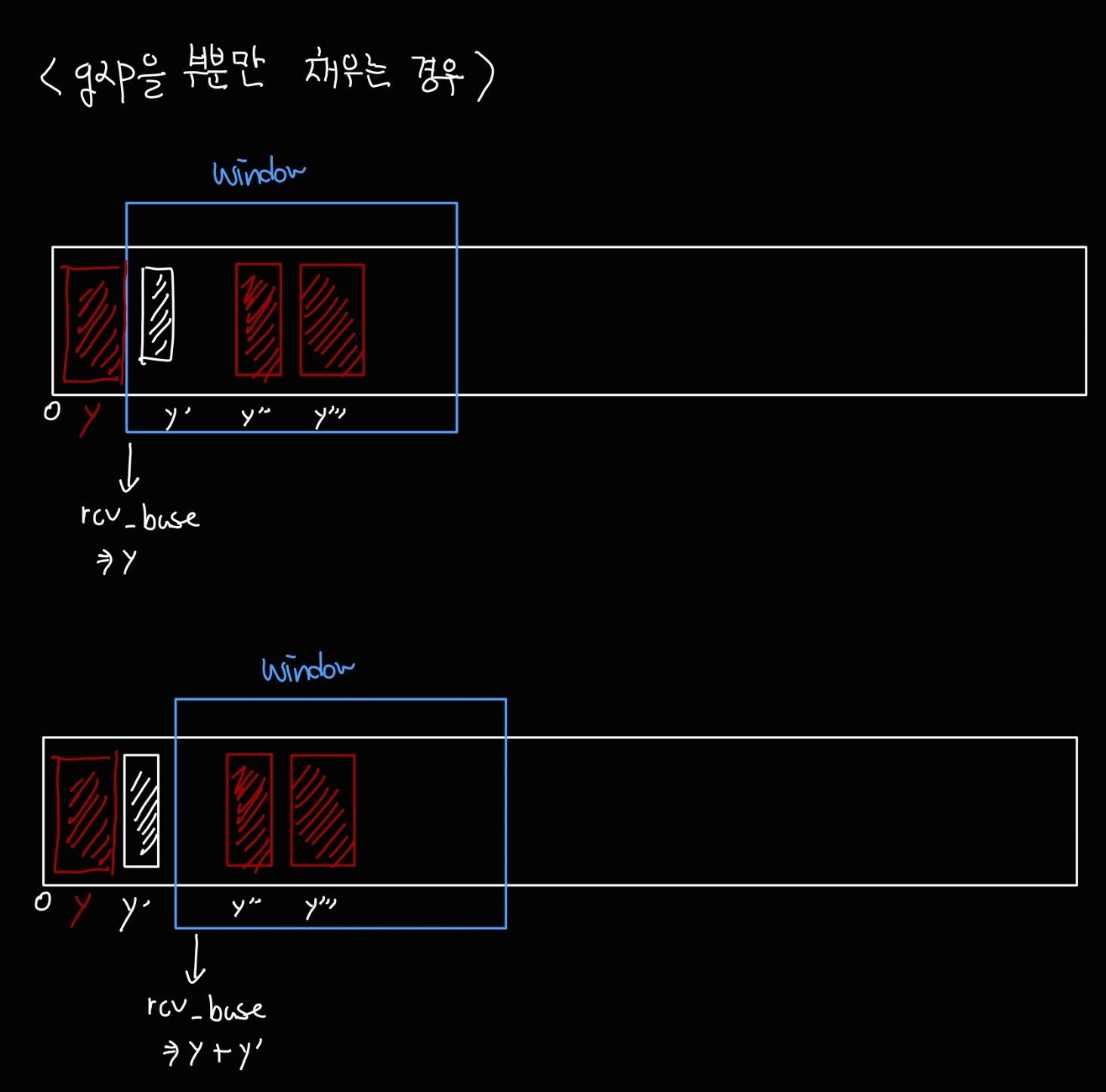 그림과 같이 부분만 채우는 경우, 채워진 부분까지 슬라이딩하고, ACK번호는 y + y` 으로 전송한다.