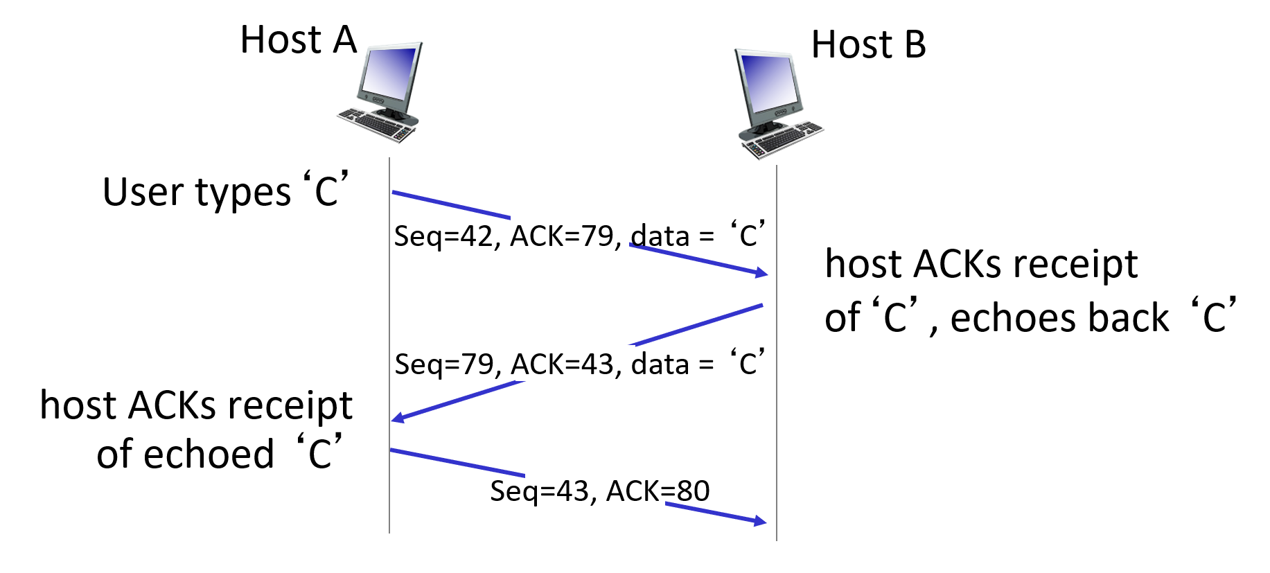 1. Host A 에서 유저가 입력한 'C' 라는 문자 (아스키 코드라면 1byte) 를 데이터로 실어 Host B 로 전송한다.