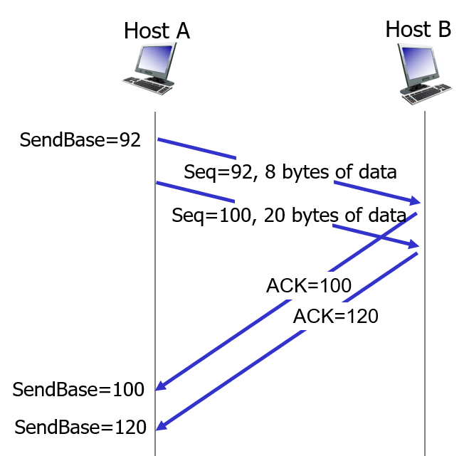 seq 92 에서 8byte를 보내고, seq 100 에서 20byte를 보냈고, Host B는 각각에 맞는 ACK를 보냈고, 모두 Host A 에 도착했다.