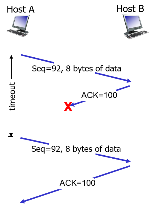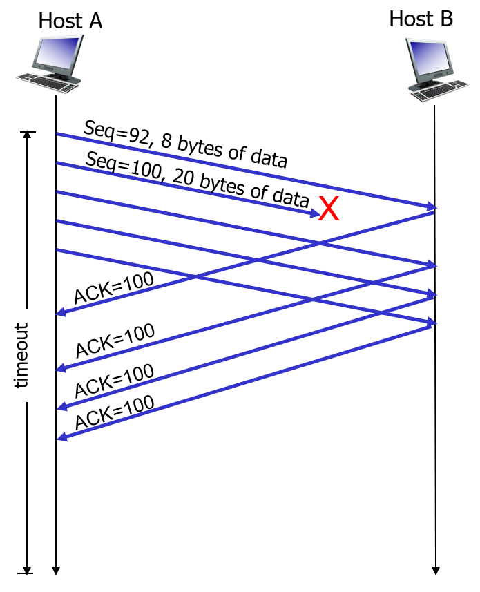 만약 리시버는 데이터를 잘 받았는데 ACK가 중간에 유실된다면 사진과 같이 timeout 이벤트가 발생한 이후 다시 동일한 세그먼트를 보낼 것이고, 리시버는 이미 받은 데이터를 또 받았으므로 내가 받고자 하는 번호인 ACK 100을 보낼 것이다.