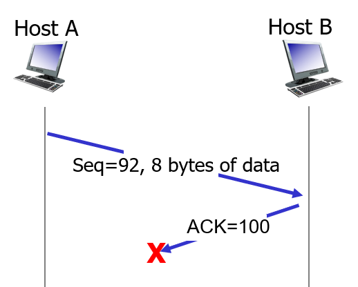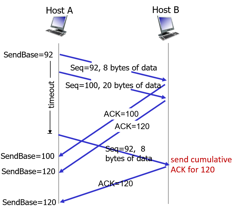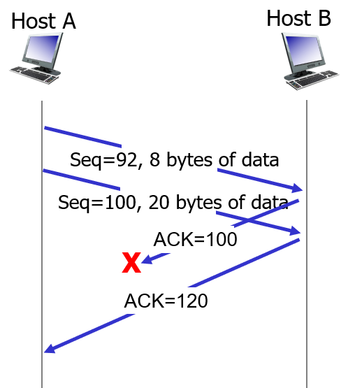 만약 92에 대한 세그먼트가 Host B에 잘 도착하지 않았다면 ACK로 92가 왔을 것이다.