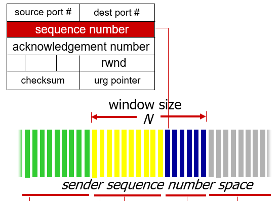 만약 파란색 부분에 있는 데이터를 보낼 때, sender 가 전송하는 TCP의 헤더에서 sequence number 필드는 첫번째 파란색 부분의 데이터의 첫번째 바이트를 가리킬 것이다.