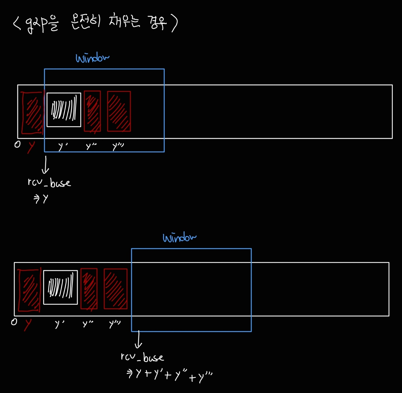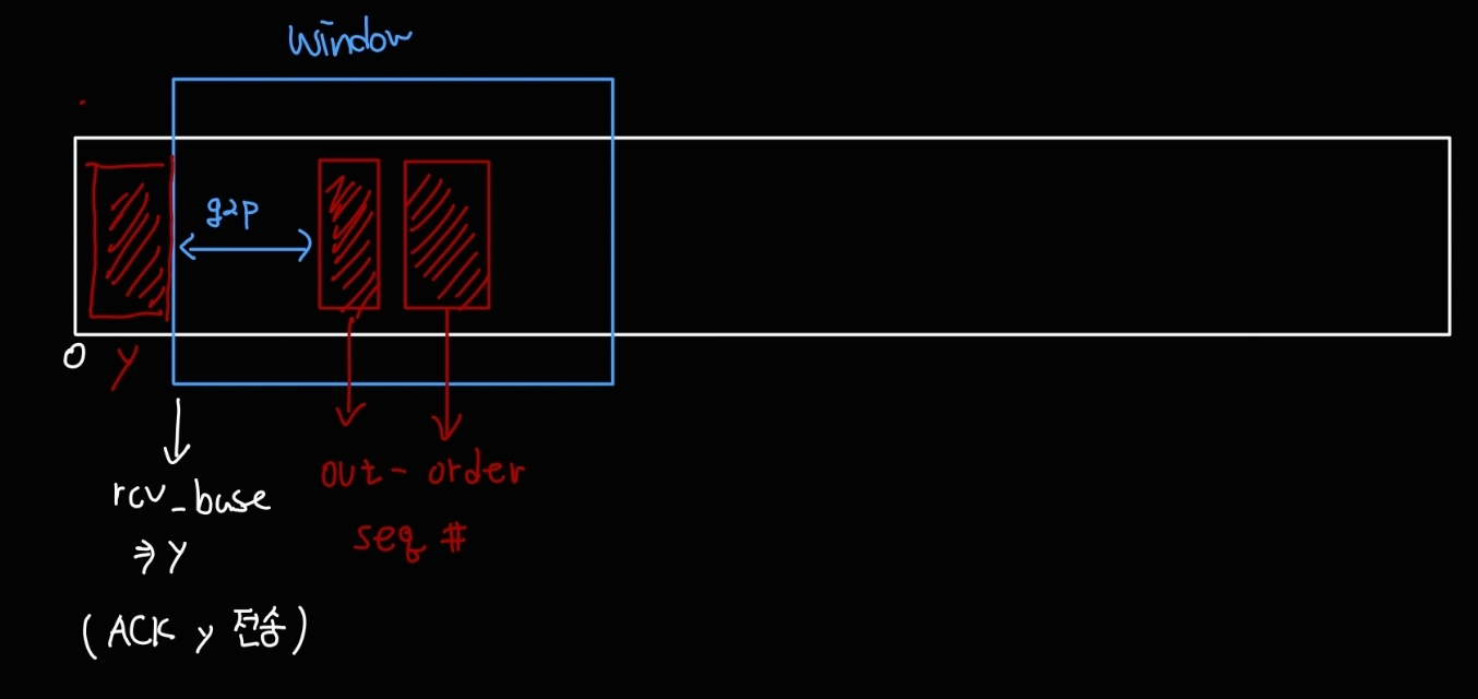 gap의 뒤쪽 일부를 채우는 경우에는 일단 갭이 메워졌으니 ACK를 보내기는 하지만 슬라이딩도 하지 않고, 자신의 rcv_base인 y를 여전히 ACK로 보낸다.