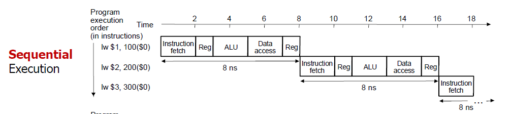 이때 만약 lw 명령어를 처리한다고 생각했을 때, 파이프라인을 적용하지 않으면 위와 같이 하나의 명령어를 처리하는데는 8ns 시간이 걸린다.