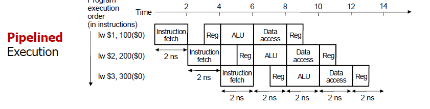 이 때 하나의 명령어를 실행하는 시간은 9ns 로 약간 늘어났으나, 그 다음 명령어부터는 처리하는데 추가로 2ns 시간밖에 필요하지 않기 때문에 3개 명령어를 실행하는데, 13ns 의 시간밖에 필요하지 않다.