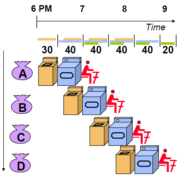 간단하게 복습하자면, 빨래를 할 때 세탁 - 건조 - 빨래 개기 단계를 다 마치고나서 다음 단계를 수행하면 하나의 일을 끝내는데는 90분의 시간이 걸리고, 4개 일을 끝내는 데에는 360분의 시간이 걸리므로, 1시간에 0.67개의 일을 수행한 것과 같았다.