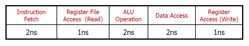 이때 만약 lw 명령어를 처리한다고 생각했을 때, 파이프라인을 적용하지 않으면 위와 같이 하나의 명령어를 처리하는데는 8ns 시간이 걸린다.