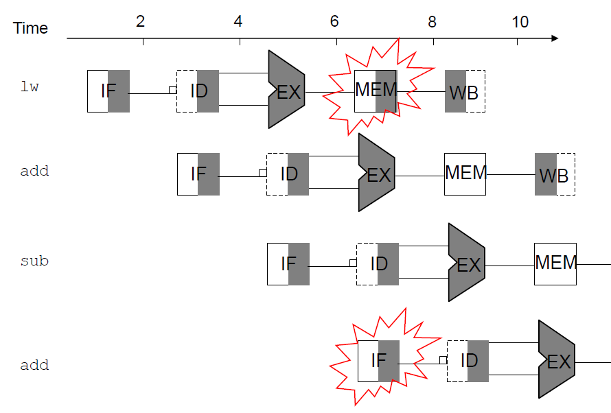 이제 이 그림을 기반으로 파이프라인으로 CPU를 설계할 때 만나게 되는 3가지 해저드를 정리해본다.