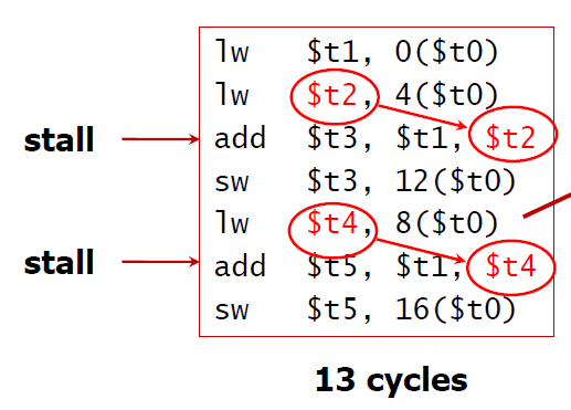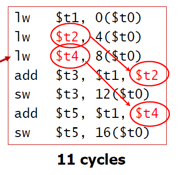 이렇게 어셈블리 코드를 재배치해서 작성하는 경우에는 stall이 발생하지 않으므로 총 11 cycle 만에 모든 명령어를 실행할 수 있다.