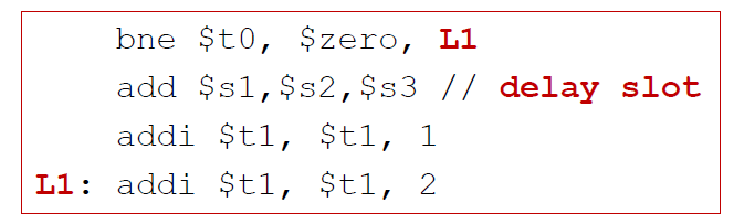 이 기법은 분기 명령어의 실행 이후에 실행하는 명령어는 분기를 하든 안하든 항상 실행될 수 밖에 없다는 것을 인정하고, 이 위치 (delay slot 이라고 부른다.) 에 분기와 상관없이 실행되어도 되는 명령어를 넣어서 실행하자는 테크닉이다.