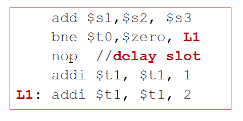 분기 명령어 이후에는 분기여부와 상관없이 명령어가 실행된다. 이때 실행할 명령어가 없으므로 nop 라는 의미없는 명령어를 넣는다.