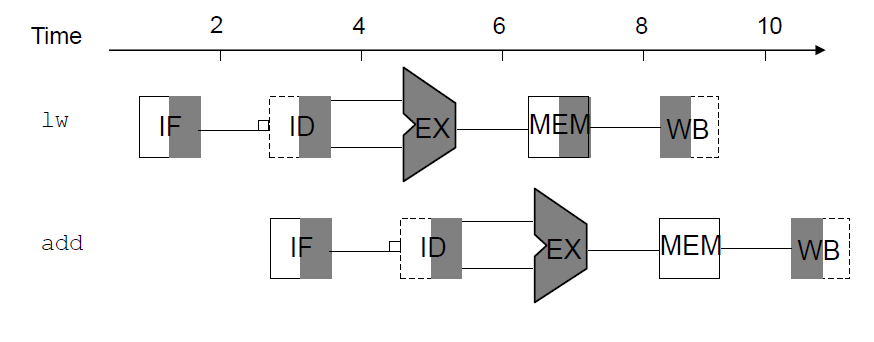 위 그림에서 ID 단계의 네모와 WB 단계의 네모는 모두 레지스터 파일을 의미한다.