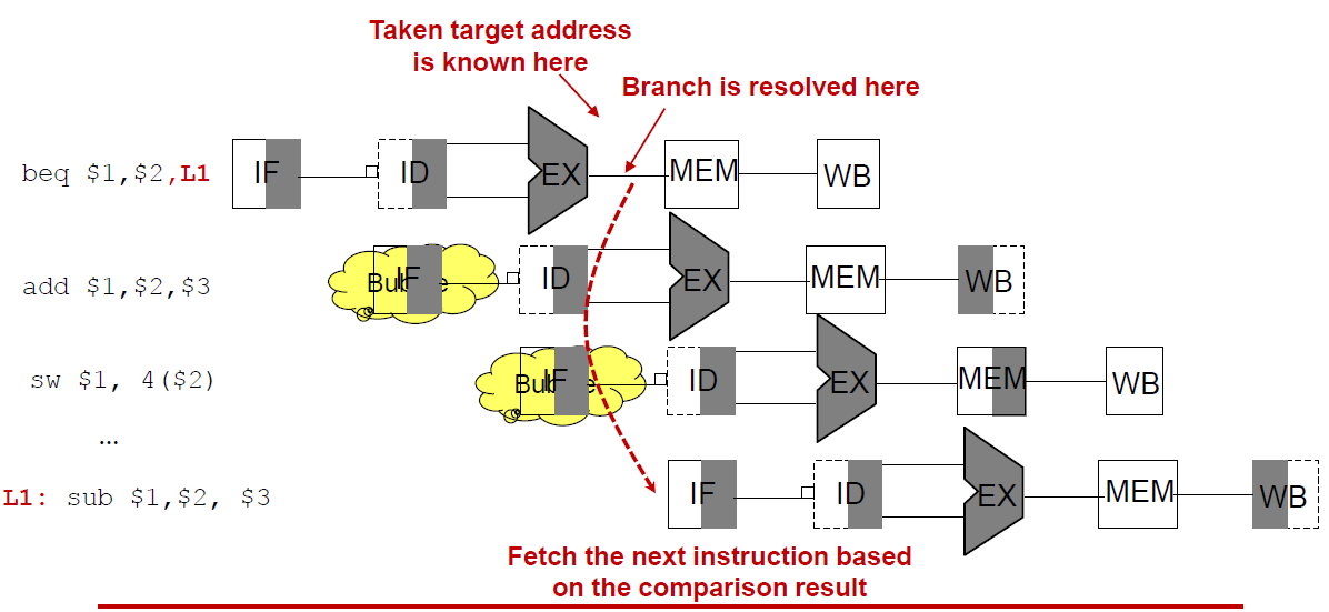 만약 분기하는 것으로 결정된다면 EX 단계까지 fetch, decode 했던 내용들은 실행되면 안되기 때문에 버리게 되고, 그 만큼 버블이 발생한다.