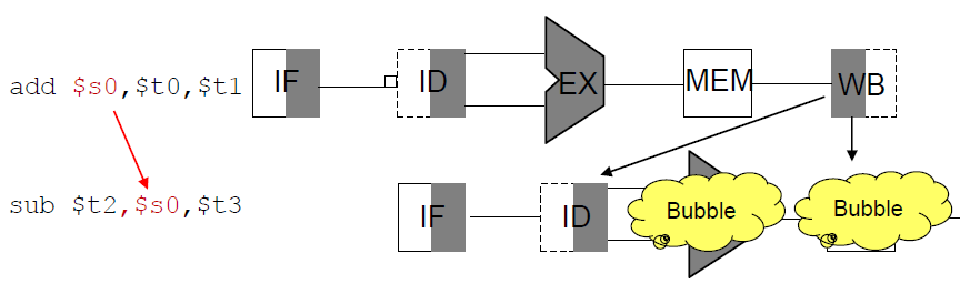 하지만 이렇게 지연을 주게 되면, 문제는 해결할 수 있지만 sub 명령어를 실행하는 response time 은 2cycle만큼 늦어지고 이는 CPU 성능의 감소로 이어진다.