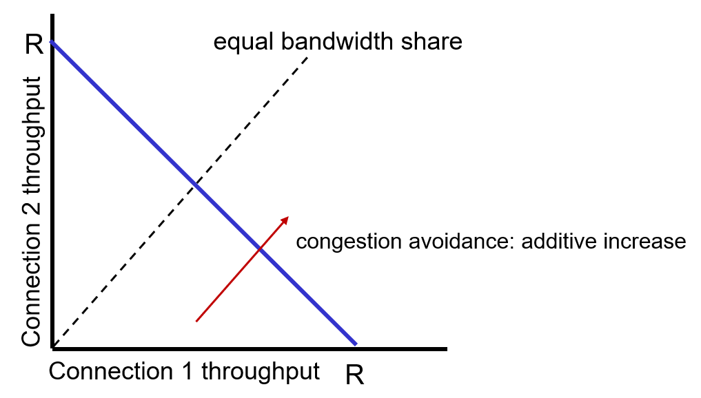 한번 단순하게 2개의 TCP connection이 R 대역폭의 같은 링크를 나눠서 사용한다고 생각해보자.