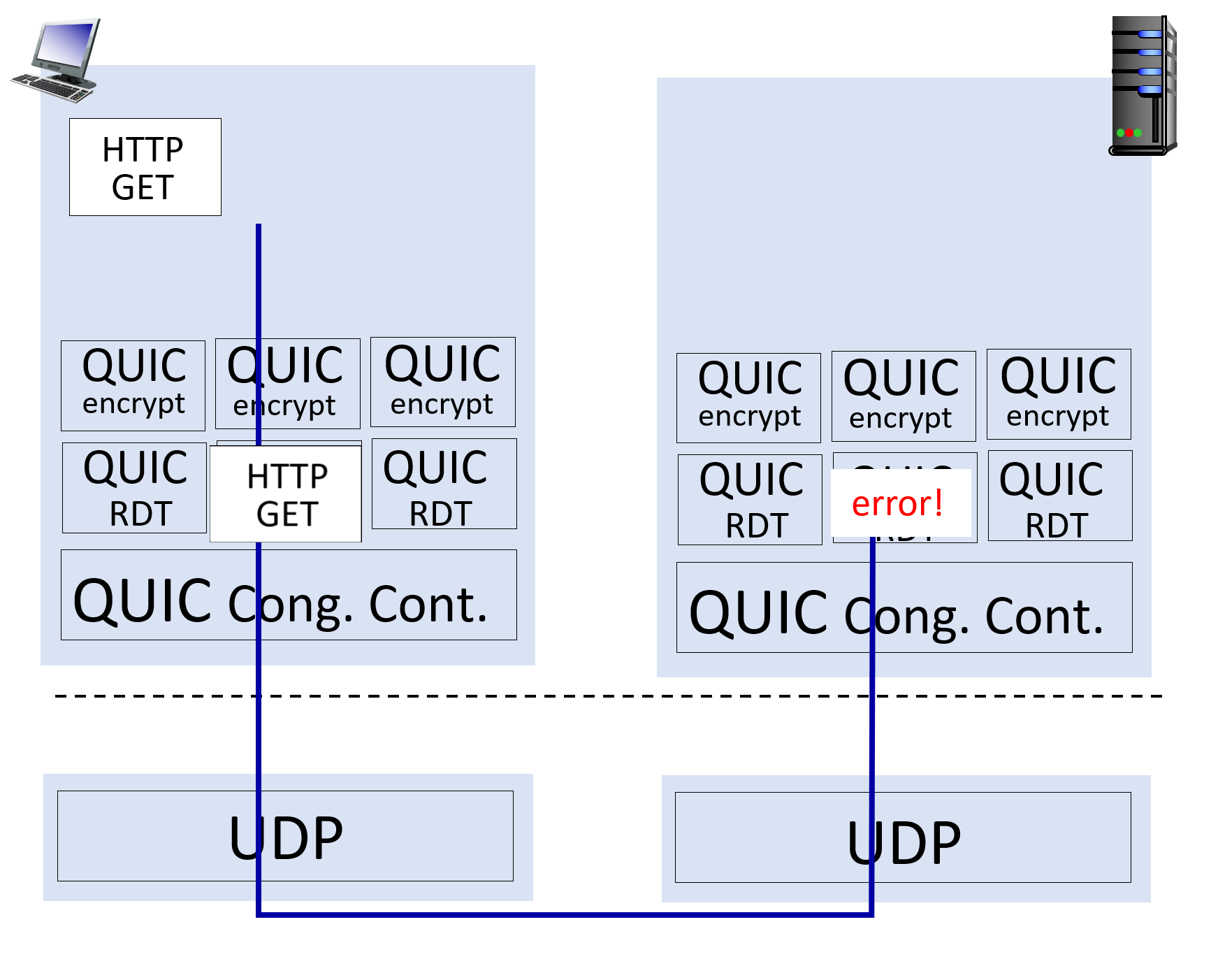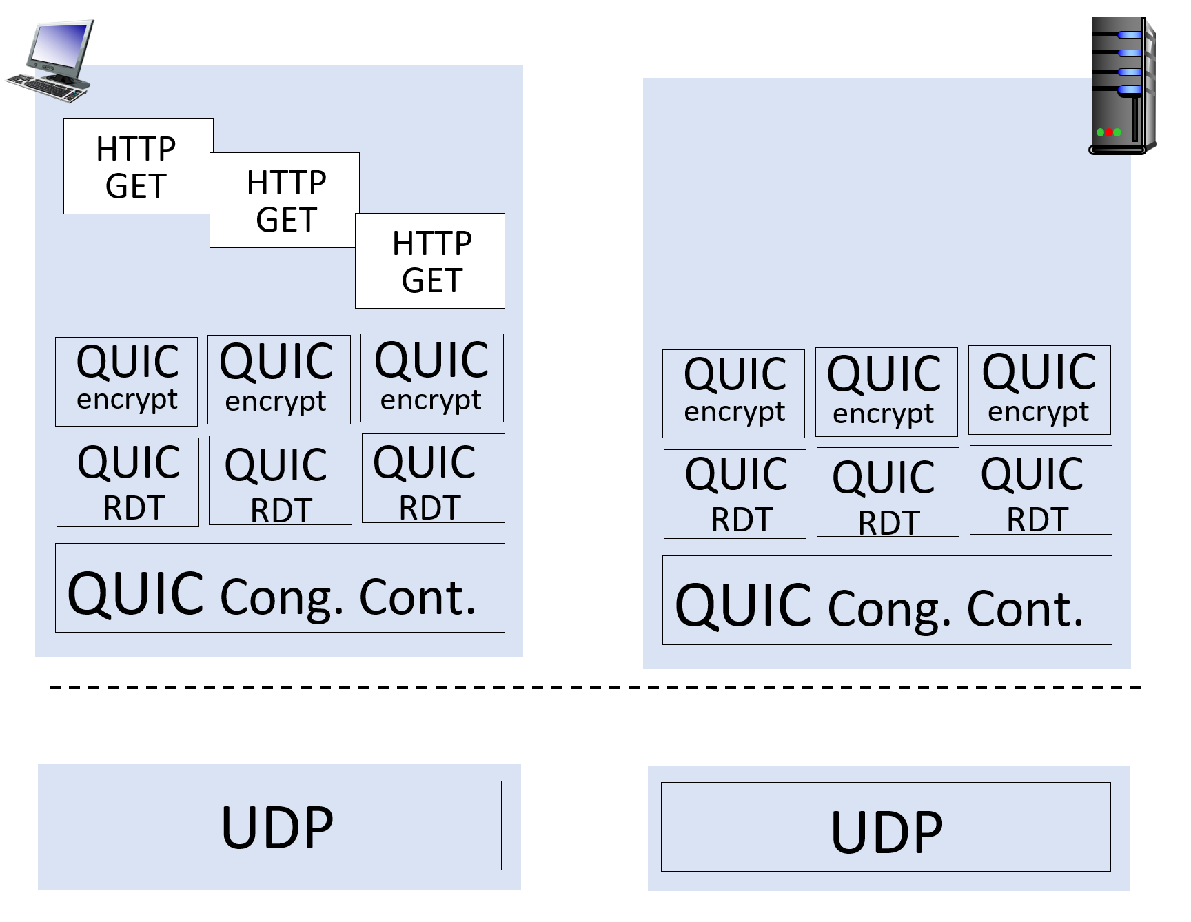 QUIC은 이 위에서 TCP가 하던 연결 설정, 패킷 loss 감지, 혼잡 제어 등을 모두 구현하고 있다.