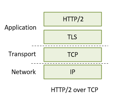 IP 위에 TCP가 있고, TCP 위에 TLS (보안을 위한 레이어), HTTP/2 가 존재한다.