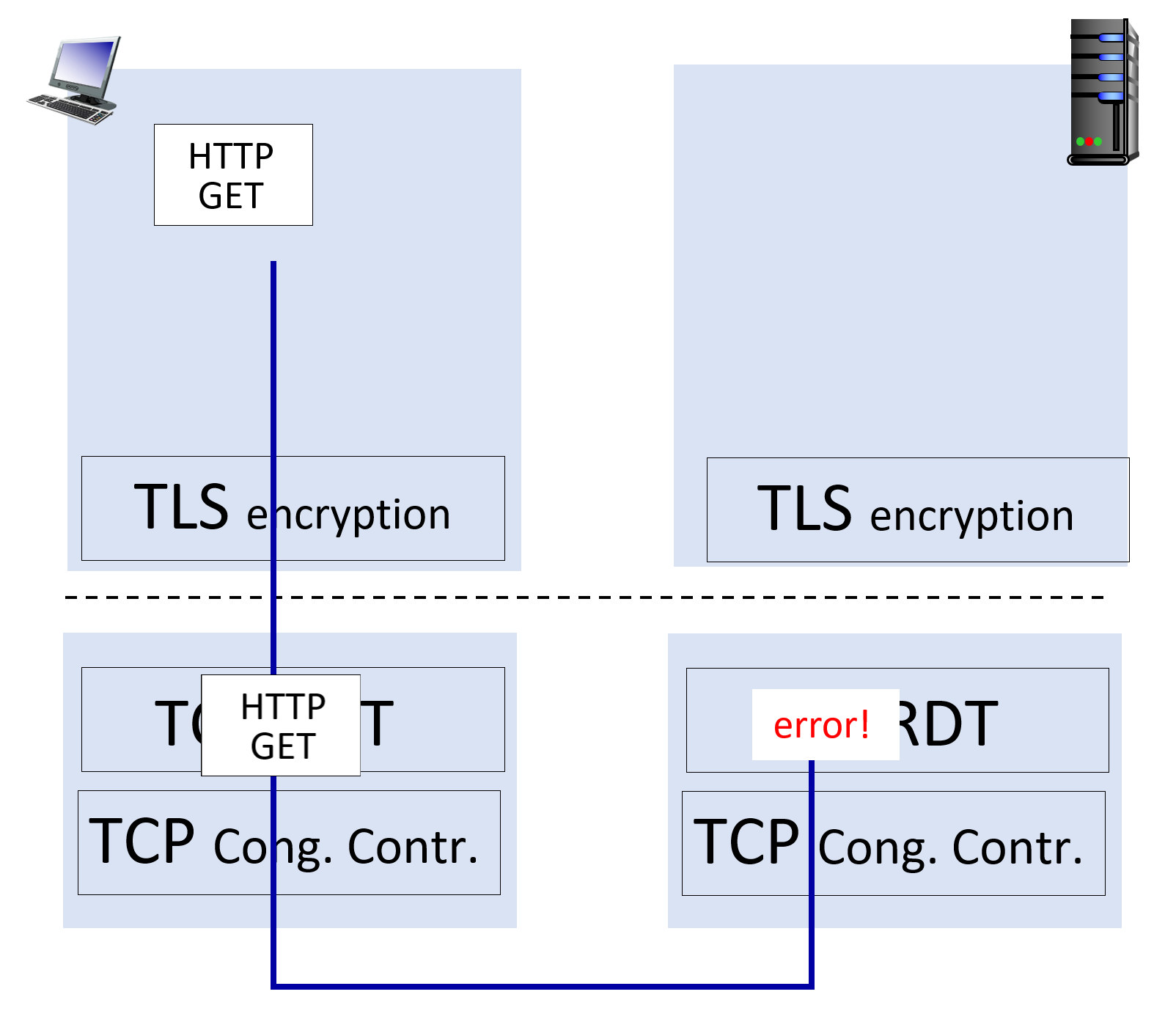 데이터를 전송할 때는 어플리케이션 메세지를 하나씩 TLS, TCP 순으로 하나씩 거쳐가며 데이터를 전송한다.