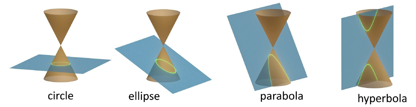 모든 conic들은 2개의 원뿔을평면으로 잘랐을 때 보이는 단면으로 얻을 수 있다.