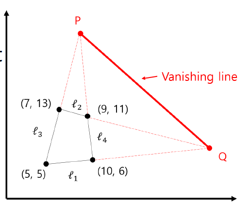 1. l1, l2 식을 구해서 이 둘의 교점을 구한다. (이 교점은 Q 점으로 나타나는데, 사실 이 점은 무한대 점이다.)