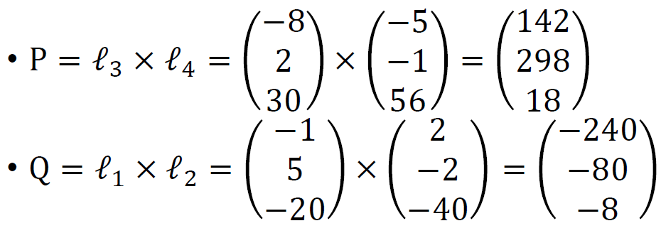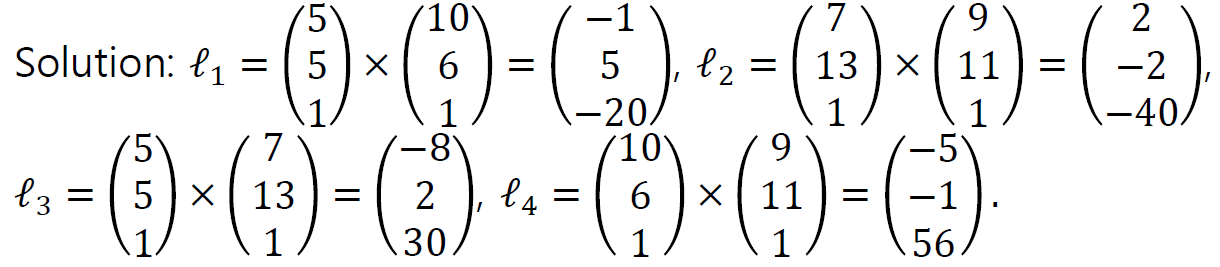 먼저 l1, l2, l3, l4는 위와 같이 두 점의 외적으로 구할 수 있다.