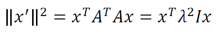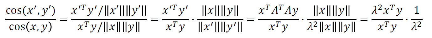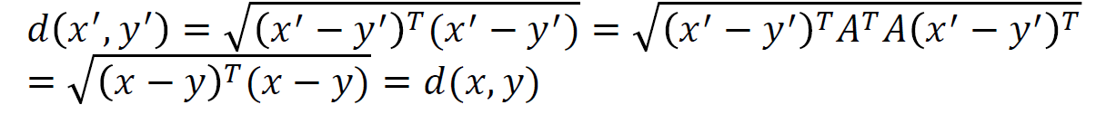 d(x', y') 은 변환된 두 점 사이의 거리를 나타낸다. 이 식 중간에 A전치와 A의 곱이 identity 를 나타내는 점을 이용하여 추가한 뒤 정리하면 d(x, y) 가 나오는 것을 볼 수 있다.