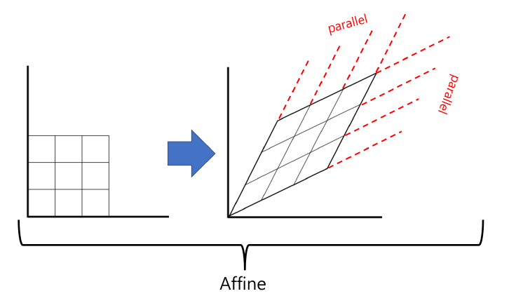 아핀변환은 직선을 직선으로 유지시킬 뿐만 아니라, 평행한 직선은 그대로 평행을 유지하도록 변환시킨다.
