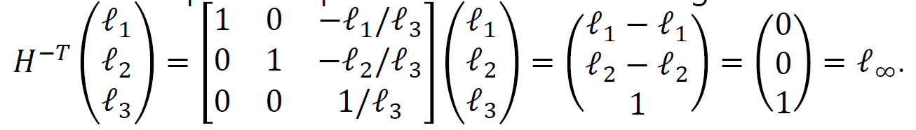 이제 이 행렬에 기존의 소실선을 넣으면, 그 소실선이 변환되기 이전의 직선이 나오는데, 이 직선은 (0 0 1) 로 무한대 직선이 나오게 된다.