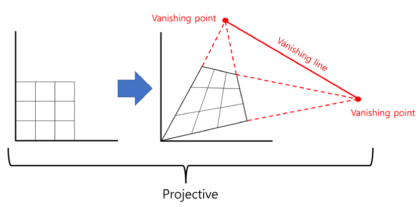 반면 일반적인 투영 변환은 무한대 직선을 어떤 직선으로 변환하게 되는데, 이 직선을 소실선 (vanishing line) 이라고 한다.