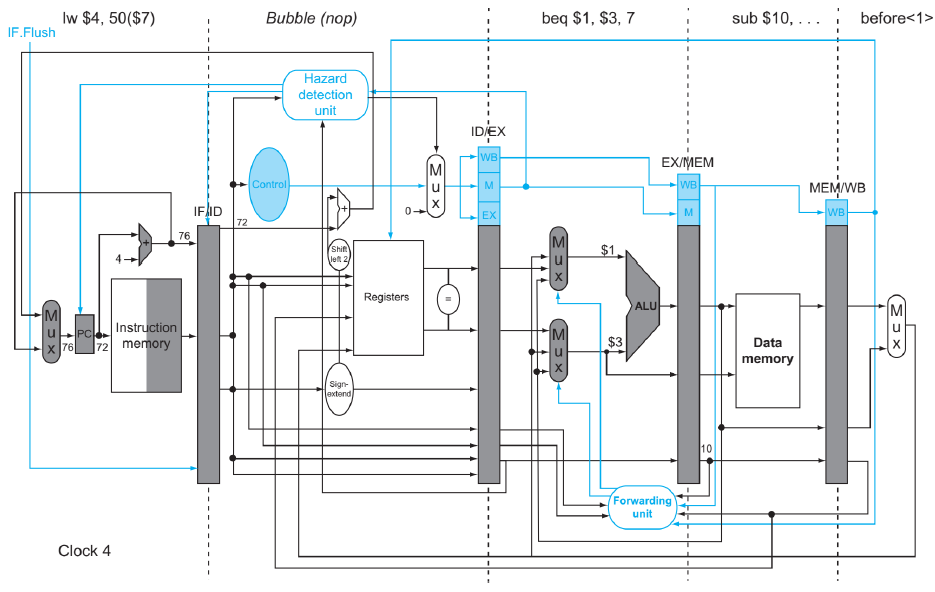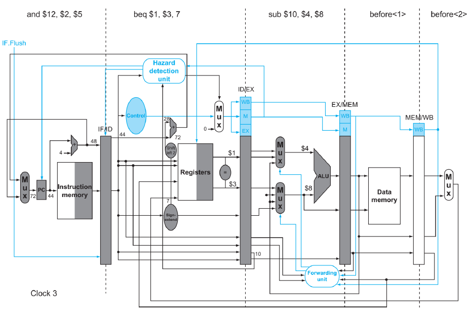 위 그림에서 beq명령어가 실행되는 시점의 PC 값은 40이고, MEM 단계까지 가고나면 분기 여부와 이때의 주소값을 알 수 있게 된다.