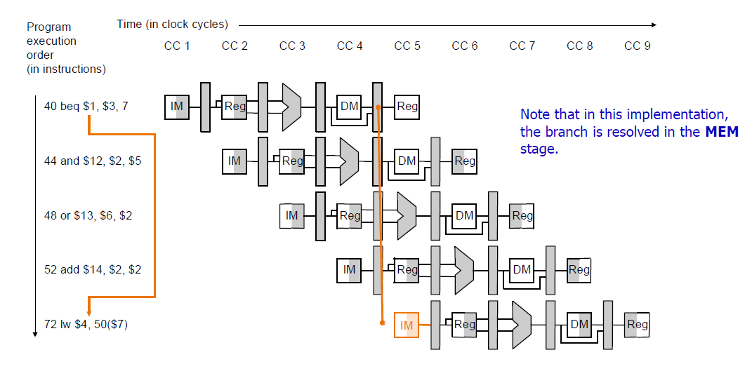 위 그림에서 beq명령어가 실행되는 시점의 PC 값은 40이고, MEM 단계까지 가고나면 분기 여부와 이때의 주소값을 알 수 있게 된다.