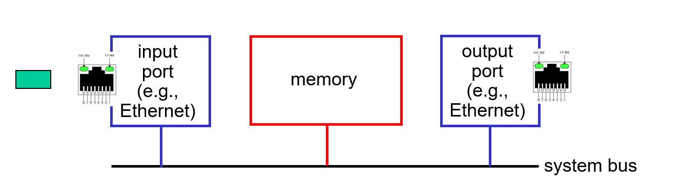 메모리의 경우, input 패킷을 받아서 copy한다음 메모리에 넣고, 메모리에 저장된 패킷을 그대로 다시 output에서 읽어가는 방식이다. 하지만 이 방식은 성능이 거의 나오지 않아서 비용이 저렴함에도 불구하고 잘 사용하지 않는다.