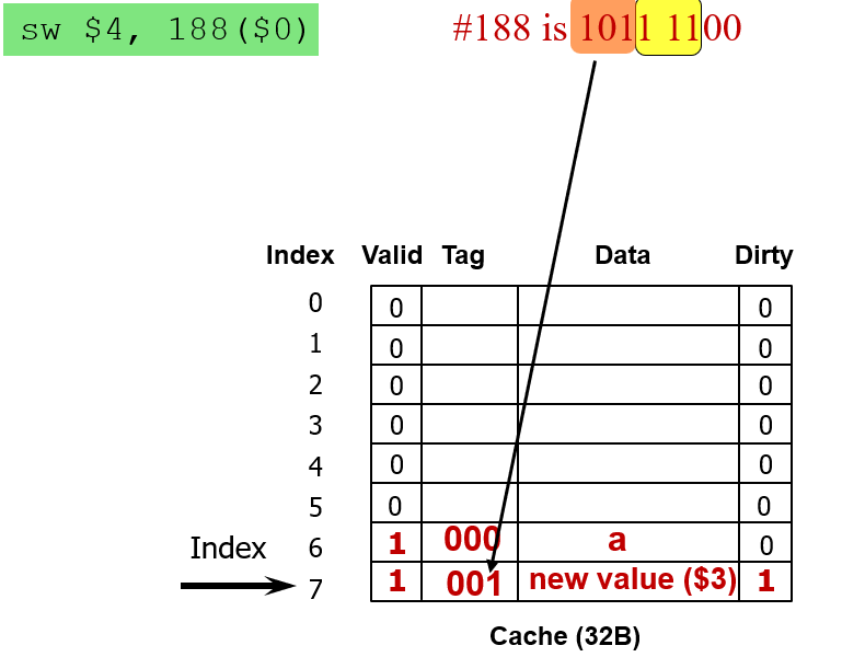 이때는 wrtie-allocate 정책에 따라 먼저 기존의 캐시 블록 데이터 (4word) 를 모두 불러온 뒤 캐시에만 값을 쓴다.