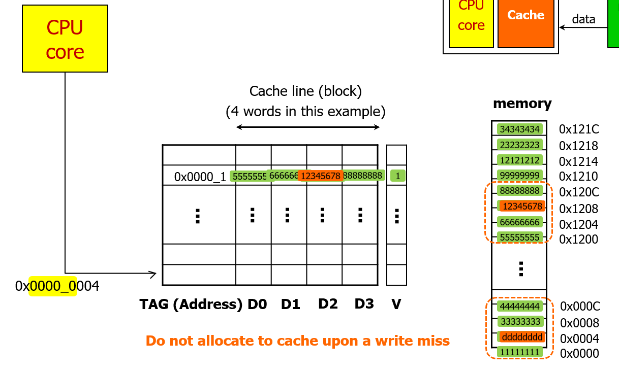 (write through 는 캐시와 그 밑에 있는 모든 메모리에 값을 쓰겠다는 것인데, 엄밀하게는 write no-allocate는 캐시에 데이터를 불러오지 않으니까 적용할 수 없는 것 아닌가?)