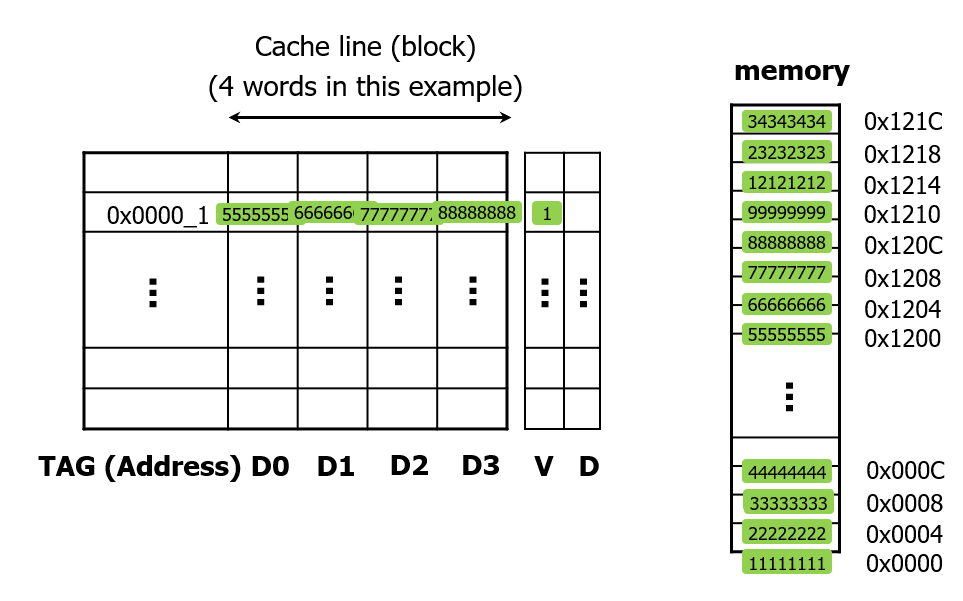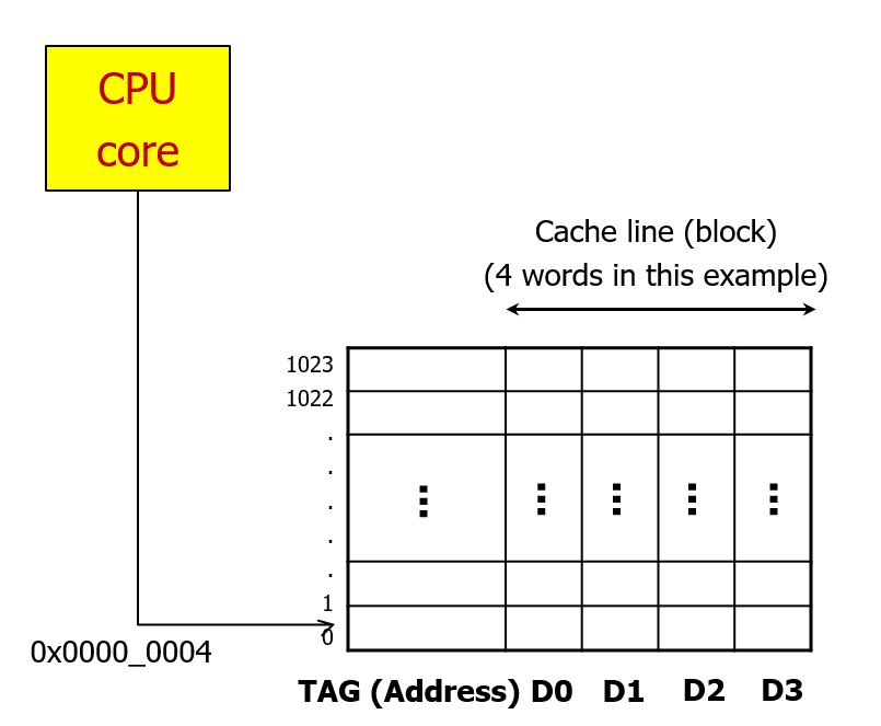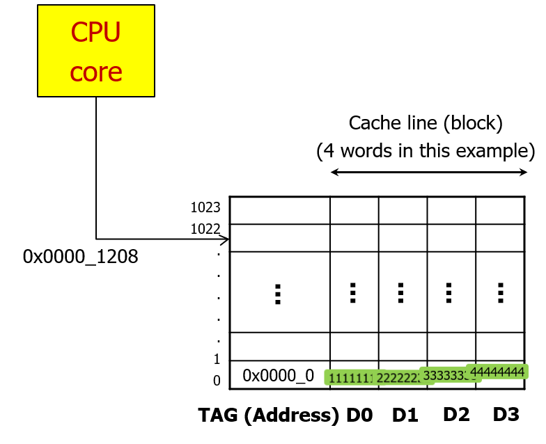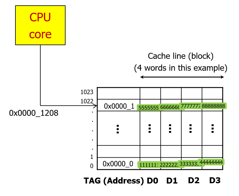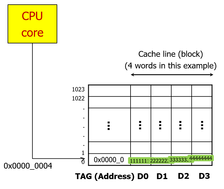 지금 당장 필요하지도 않은 데이터까지 가져오는 것이 불필요해보이지만, 만약 미래에 CPU가 0x000C 위치의 데이터를 요구한다면 이때는 메모리까지 가지 않아도 캐시가 직접 44444444라는 값을 바로 보내줄 수 있다.