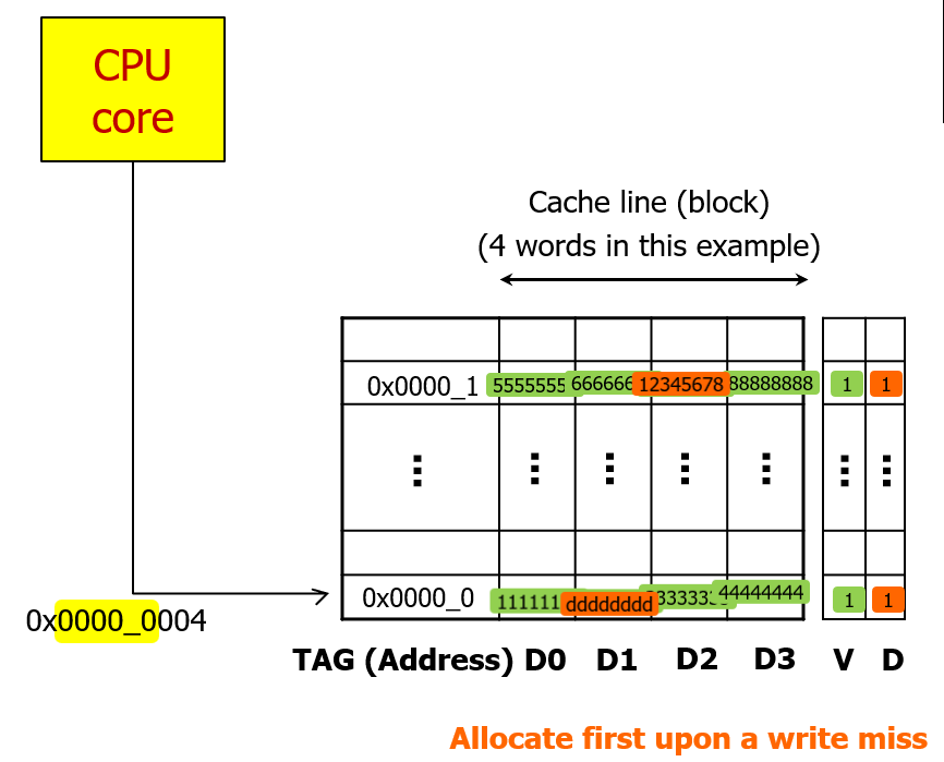 write-allocate & write-back 방식으로 메모리에서 block 데이터를 캐시에 할당한 뒤, 캐시에만 업데이트 하고 dirty bit 를 세팅하거나,