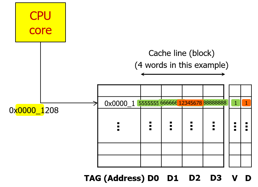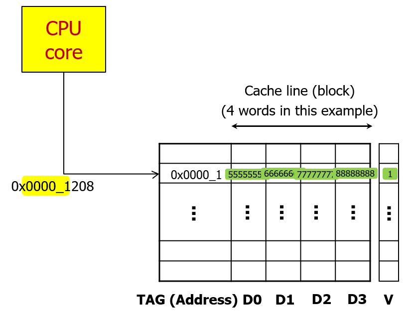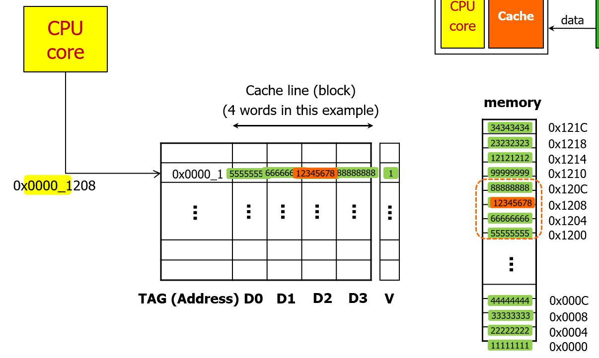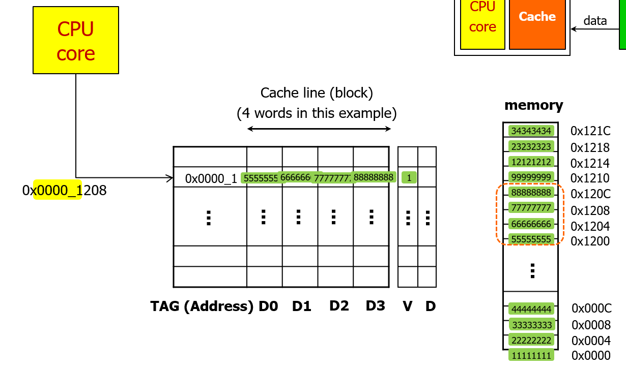 이번에는 비슷하게 0x0000_1208 위치에 있는 데이터를 요구한다면, 다시 캐시를 확인해보고 캐시에 데이터가 없다면 마찬가지로 미리 정의한 블록 크기 단위로 데이터를 읽어서 캐시로 가져올 것이다.