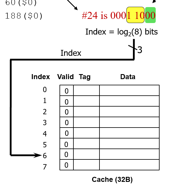 8개 캐시의 블록을 구분하려면 000부터 111까지 3개 bit를 사용해서 구분할 수 있다.