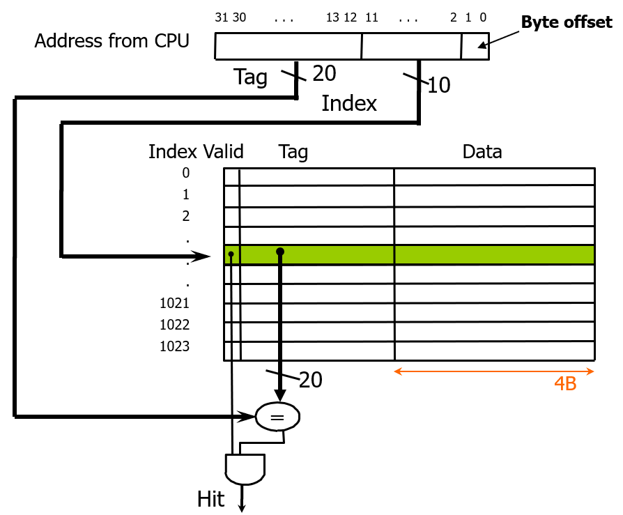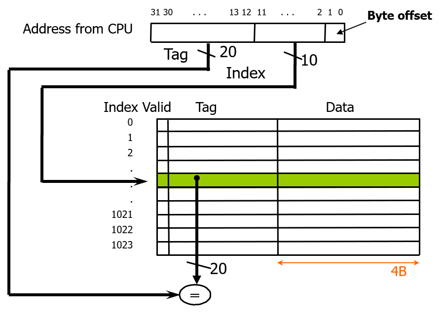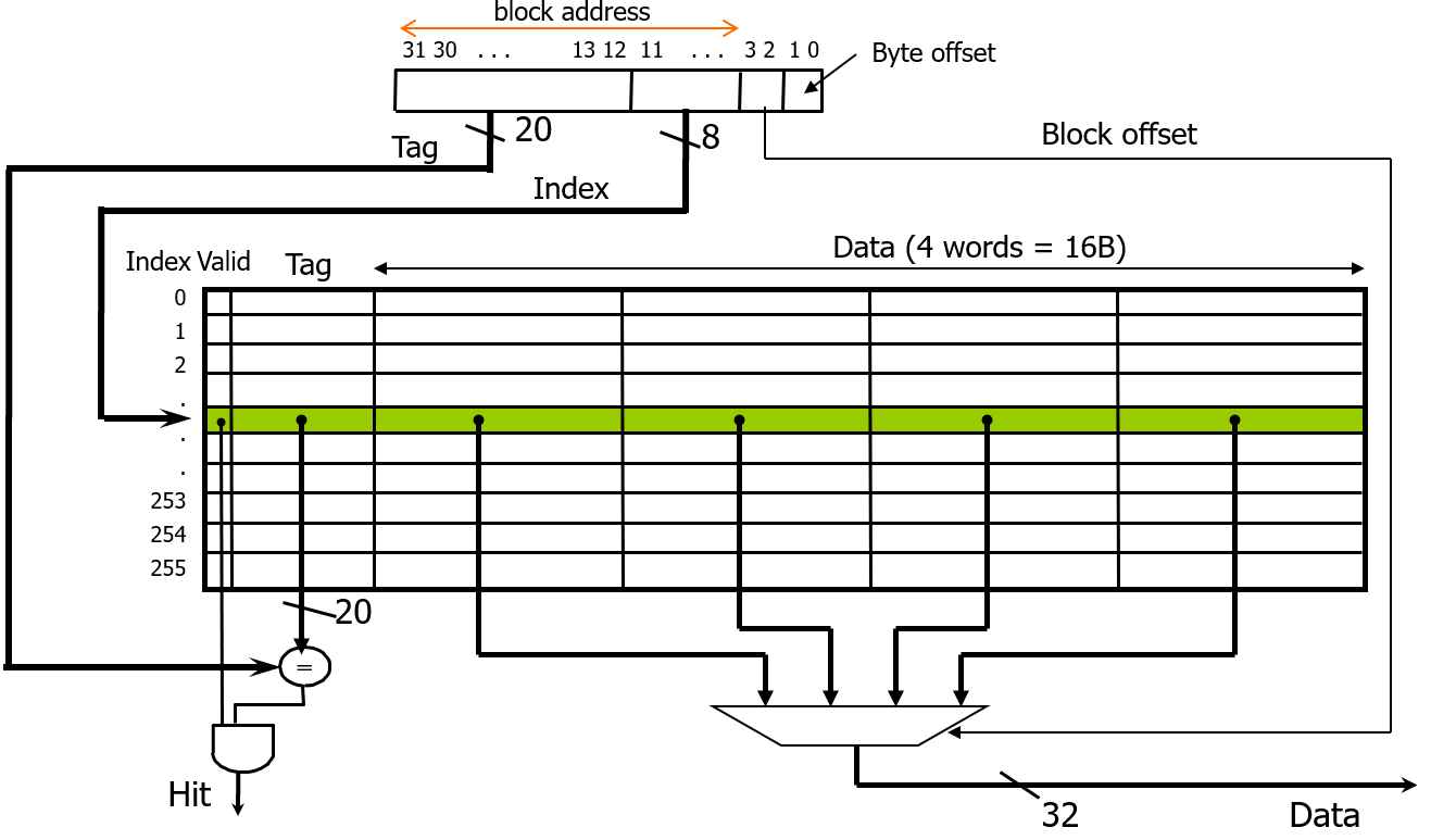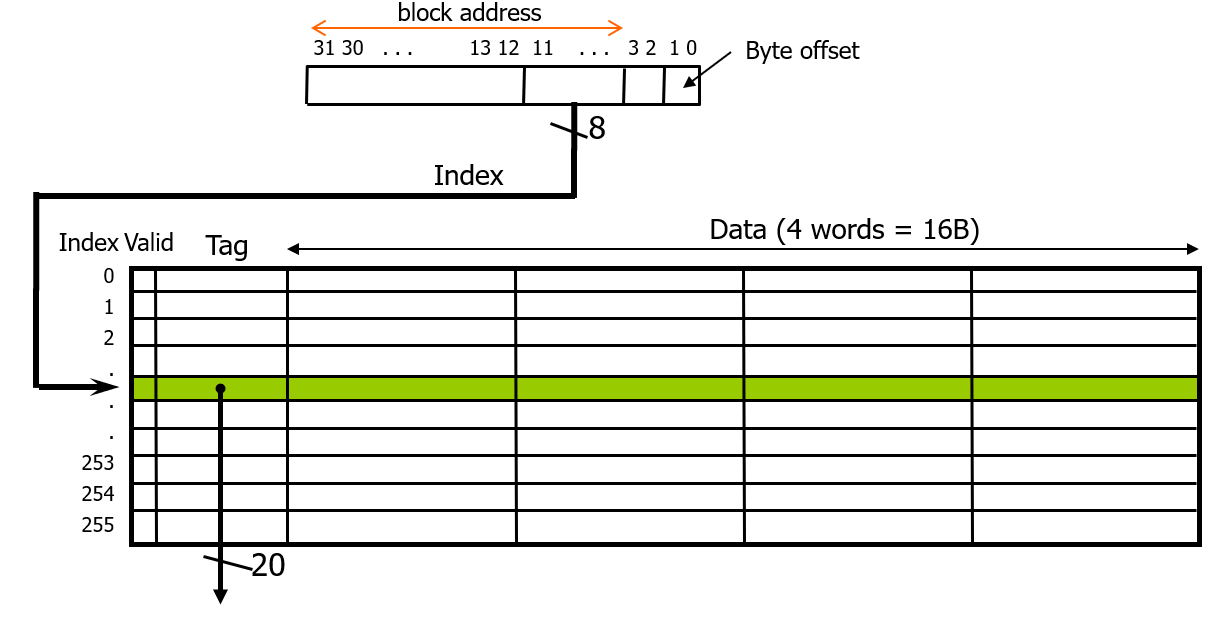 따라서 byte offset 으로 2bit를 빼고, 4개 word 가 1block 이므로 block offset 으로 2bit 를 빼고, 남은 나머지 block address에서 캐시에 들어있는 256개의 block 을 구분할 인덱스를 위해 하위 8개 bit를 빼면 남은 20bit 가 tag가 된다.